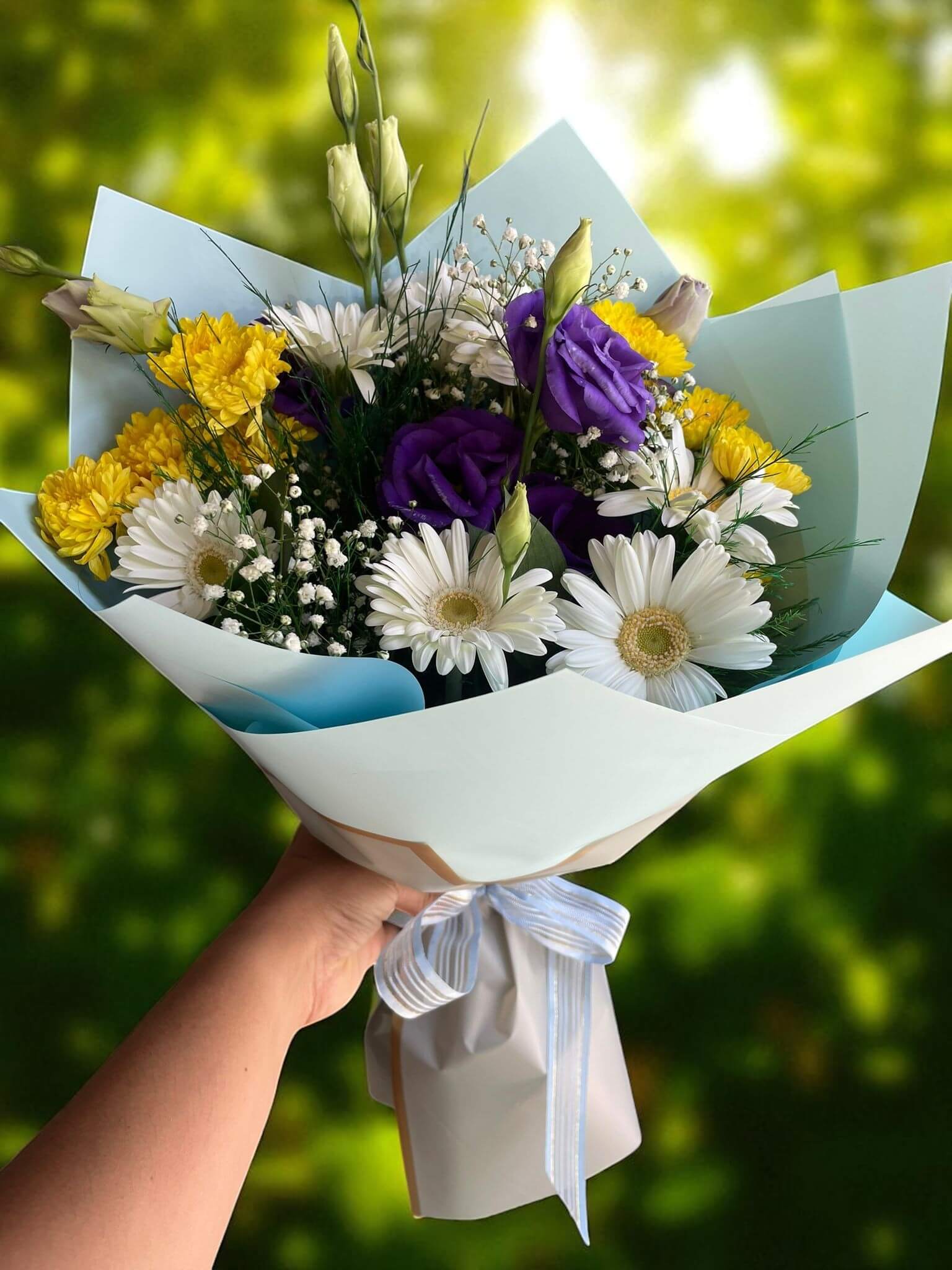 Beyaz, mor ve sarının enerjisiyle canlanan bu karışık buket, neşeli ve canlı bir atmosfer sunar.