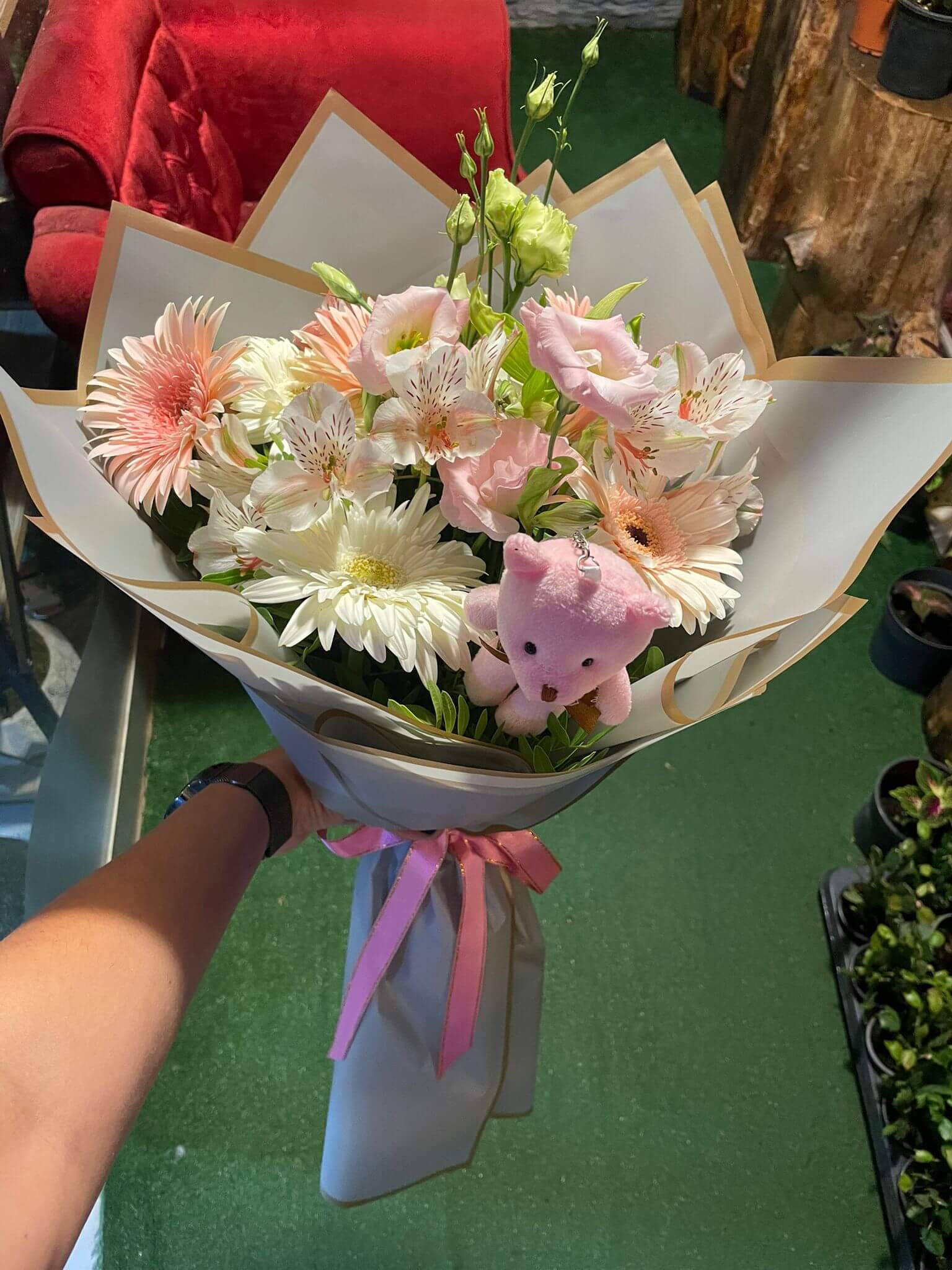 Her biri özenle seçilen çiçekler, sakin ama etkileyici bir duyguyu ifade ediyor. Pembe tonlar, sevgi ve şefkati temsil ederken; beyaz, saflığın ve içtenliğin simgesi oluyor. Buket, genel havasıyla zarif, samimi ve estetik bir denge sunuyor.
