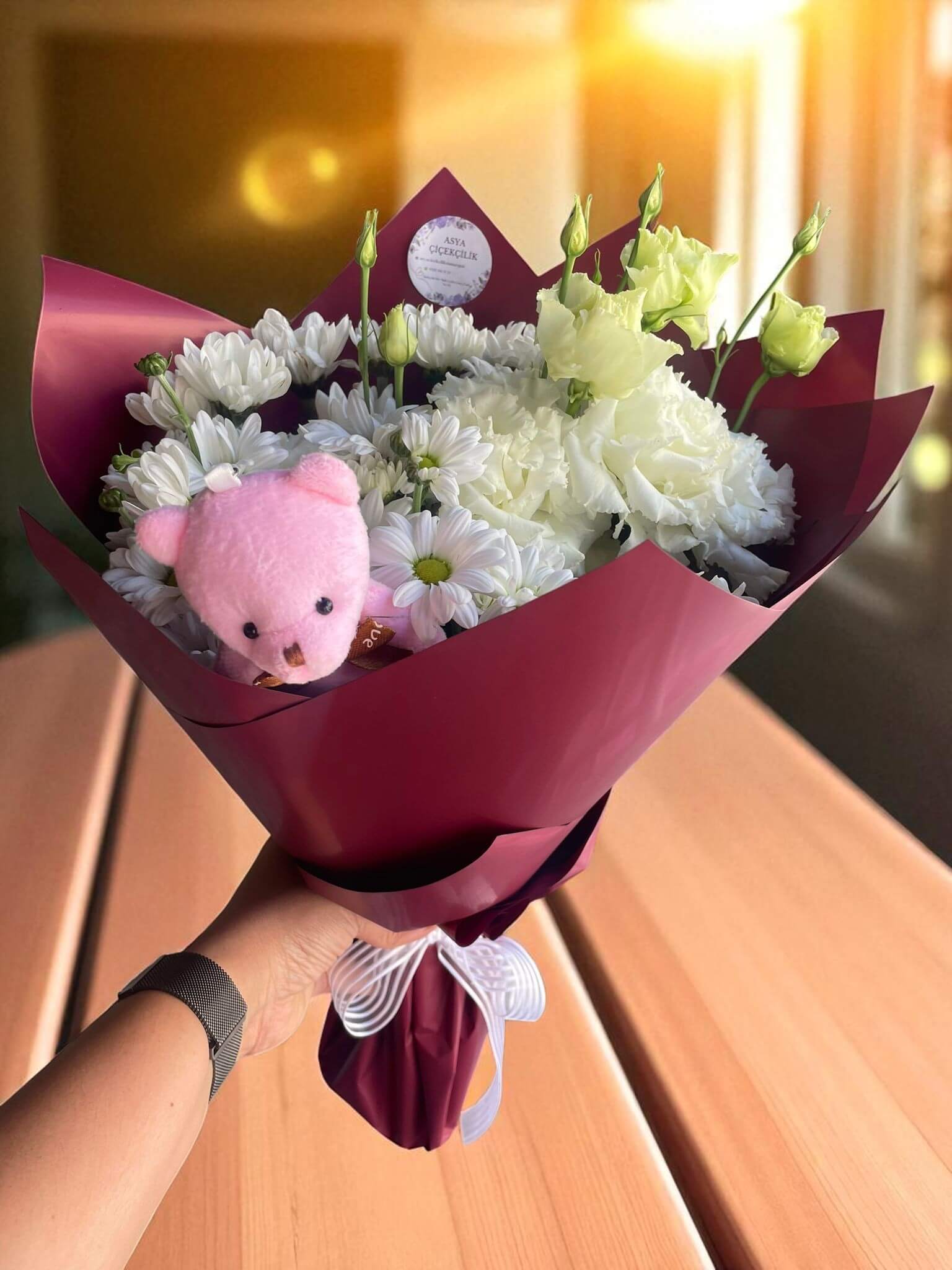 Ayıcık detayı, özellikle samimi ve sıcak duyguların ifadesinde önemli bir rol oynarken, papatyaların doğallığı bu hediyeyi abartıdan uzak, saf bir sevgi sembolü yapıyor. İster bir “gülümsetmek için” hediyesi, ister küçük ama anlamlı bir teşekkür olarak sunulabilir.