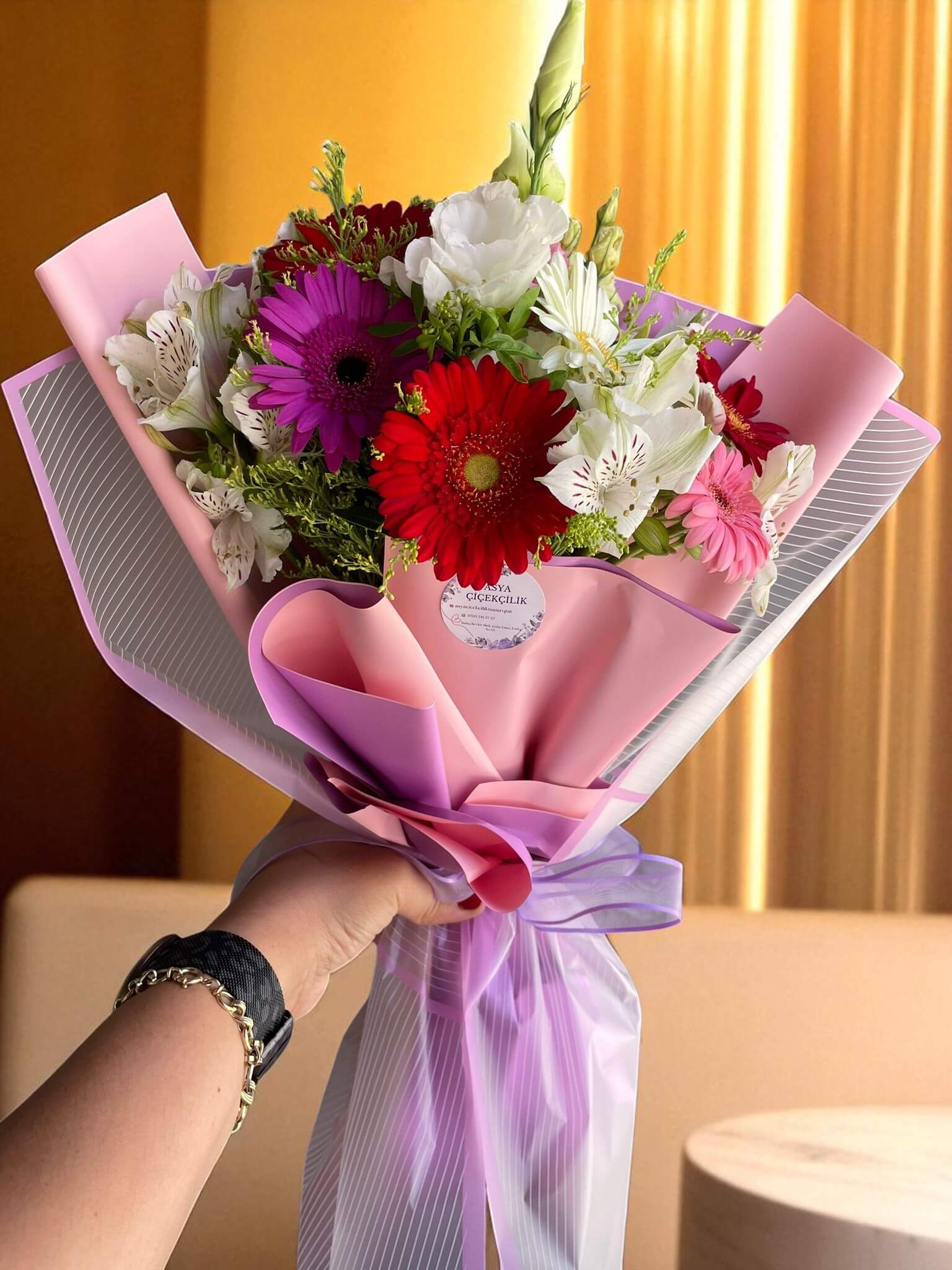 Bu mini buket, kırmızı, beyaz ve mor renklerdeki çiçeklerin canlı ve uyumlu birleşiminden oluşuyor. Küçük boyutuna rağmen renklerin enerjisiyle göz dolduruyor. Zarif ve neşeli tasarımı, sevgi dolu küçük jestler için ideal.