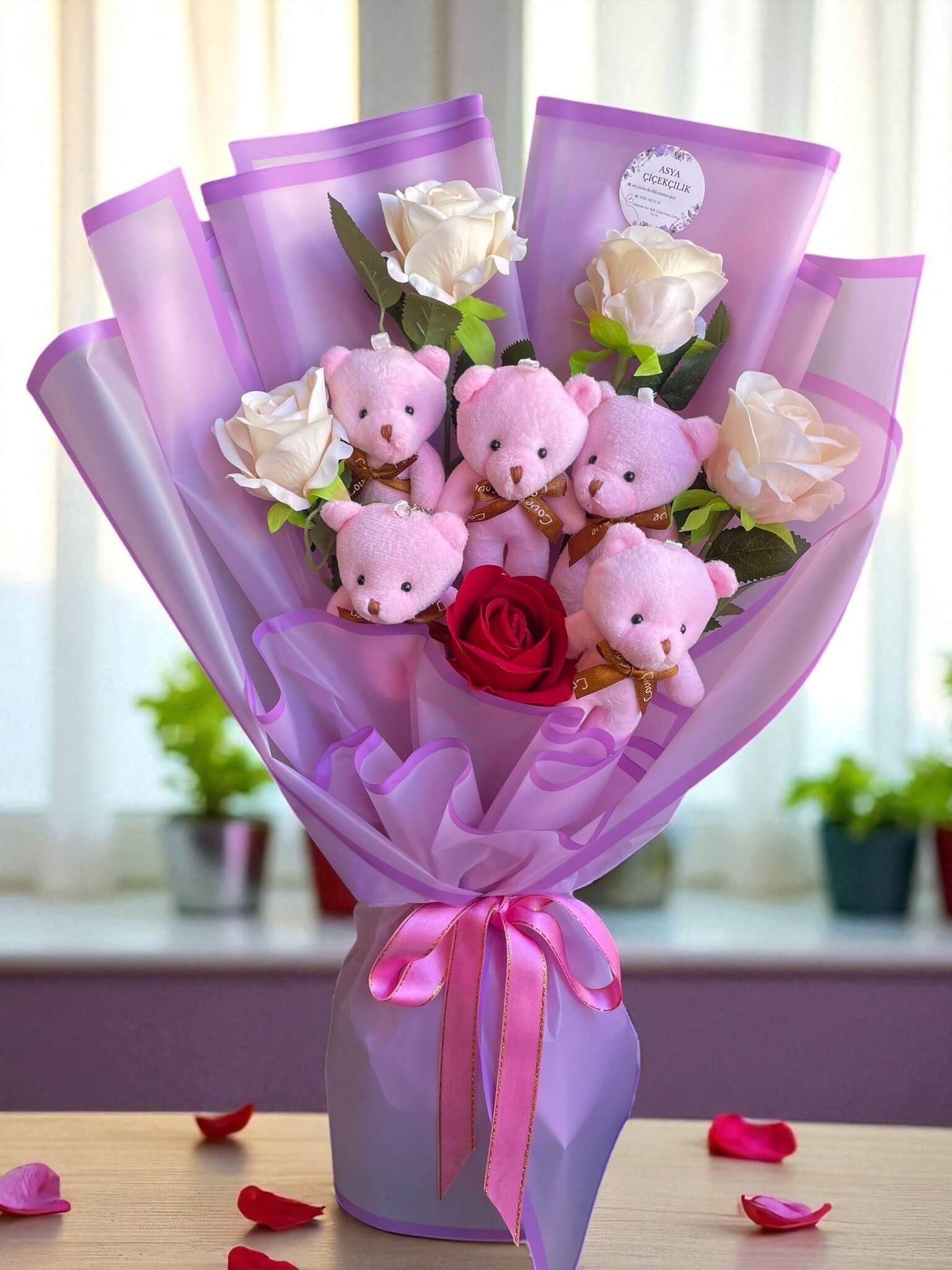 Bu özel buket, saf beyaz güllerin saflığını ve sevimli ayıcıkların sıcaklığını bir araya getirerek şıklık ve sevgi dolu bir ifade sunuyor. Zarif detaylarla hazırlanan bu aranjman, hem görsel hem duygusal açıdan etkileyici bir hediye seçeneği.