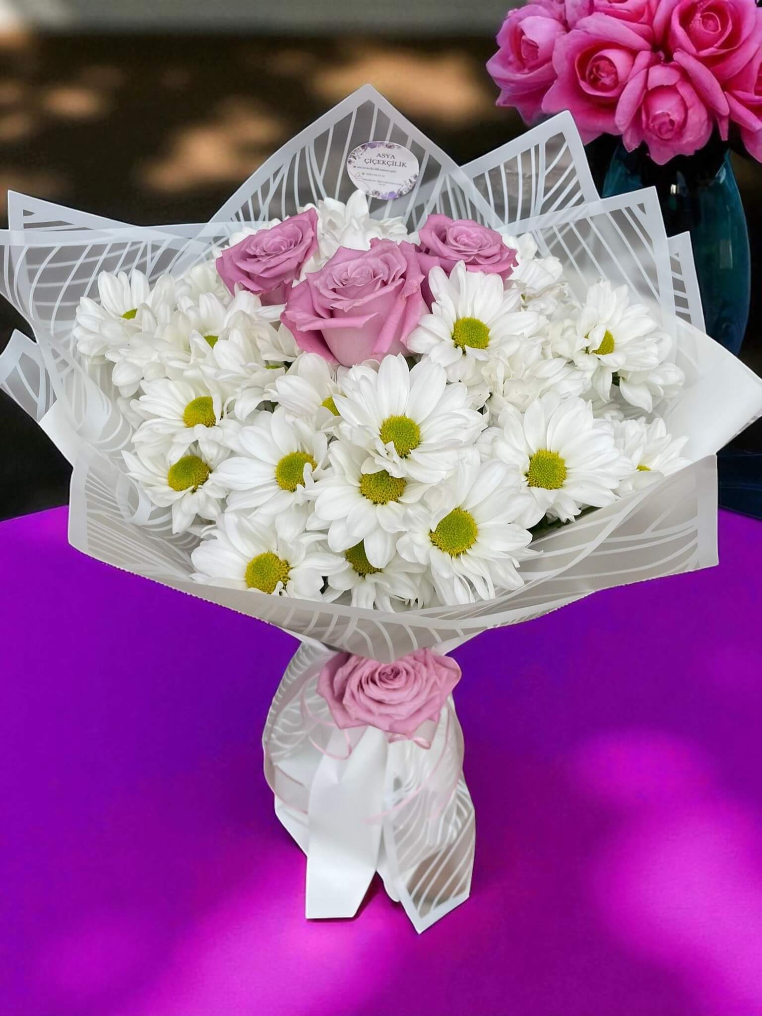 Papatyaların içten gülümseyişiyle, lila güllerin büyüleyici zarafeti bu bukette mükemmel bir uyum yakalıyor. Her biri özenle seçilen çiçekler, dinginliğin ve sevgi dolu hislerin bir araya geldiği zarif bir atmosfer sunuyor. Papatyaların doğallığı, lila güllerin asil tonu ile dengelenerek oldukça etkileyici bir kontrast oluşturuyor.