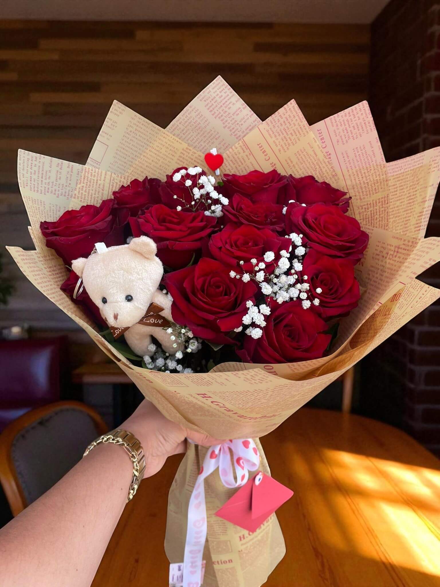 12 adet canlı kırmızı gül, sevginin ve tutkunun en güzel sembolü olarak bu özel bukette yerini alıyor. Yanında duran sevimli ayıcık ise hediyenize sıcaklık ve samimiyet katıyor. Bu kombinasyon, hem duygusal hem de neşeli bir atmosfer yaratmak isteyenler için ideal.