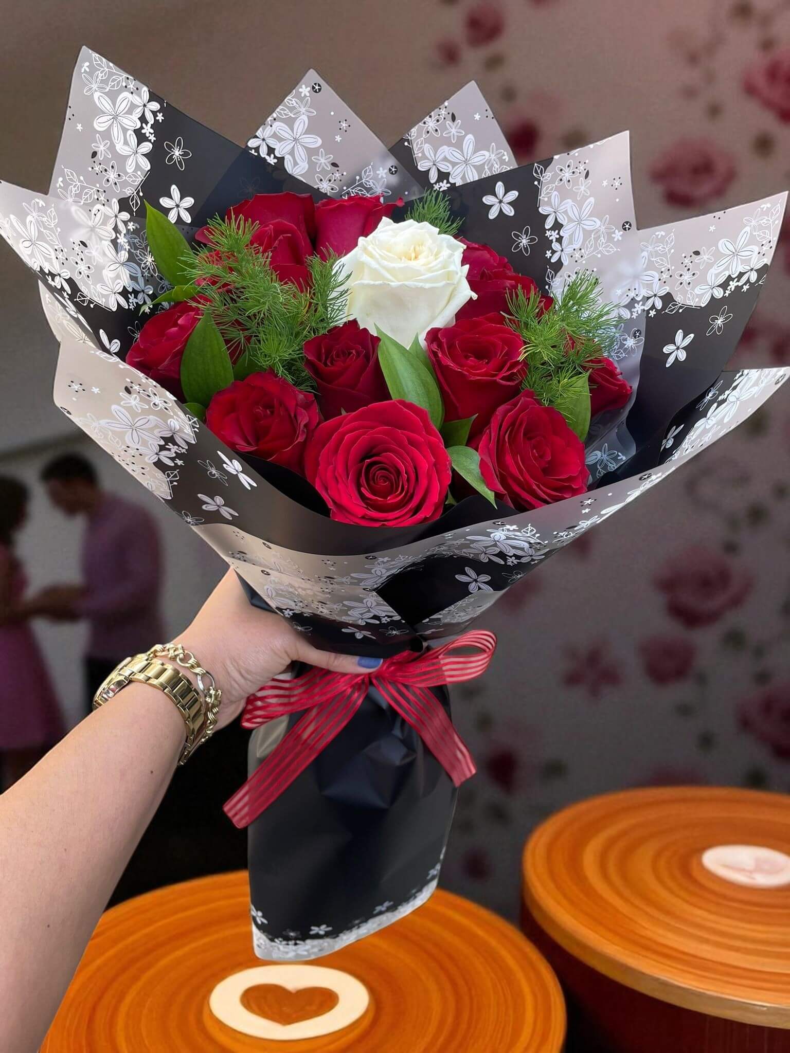 Güller özenle yerleştirilmiş, renk kontrastı sayesinde beyaz gül çarpıcı bir şekilde öne çıkmış. Abartısız ama güçlü bir tasarıma sahip olan bu buket, hem klasik hem de modern bir estetik taşıyor.