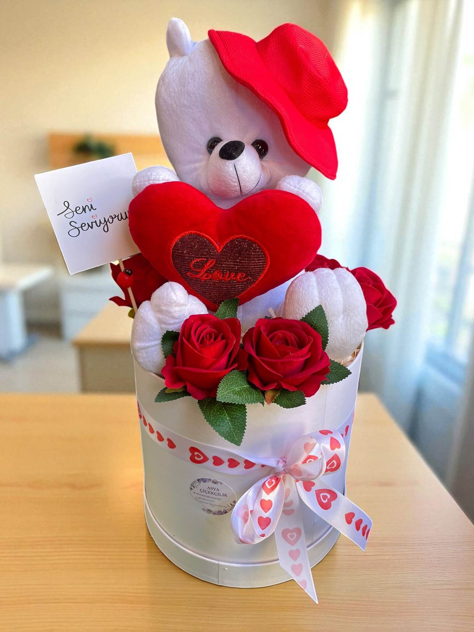 Bu özel hediye paketi, beyaz yuvarlak kutu içerisinde şirin bir beyaz ayıcık ve birkaç canlı kırmızı gülden oluşuyor. Beyazın saflığı ve kırmızının tutkusunu bir araya getiren bu kombinasyon, hem göz alıcı hem de duygusal bir dokunuş sunuyor.