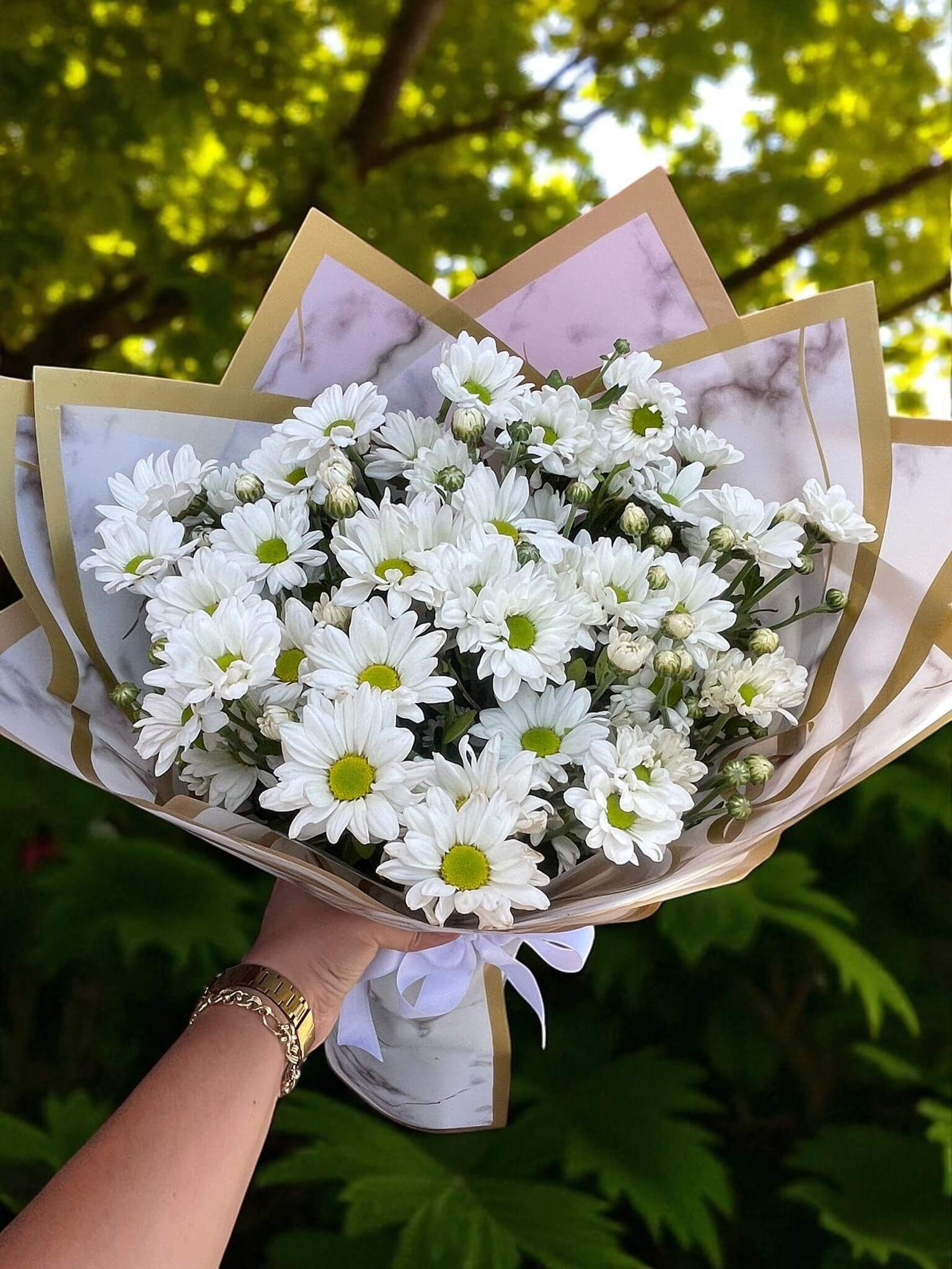 Saflığın simgesi beyaz papatyalar, zarif paketle tamamlandı. Sadelik ve şıklık arayanlar için ideal bir seçim.